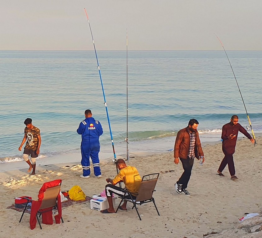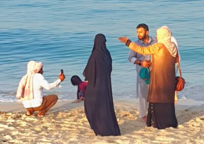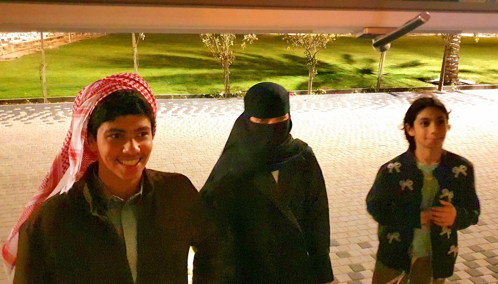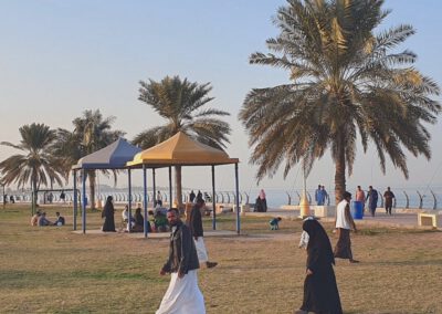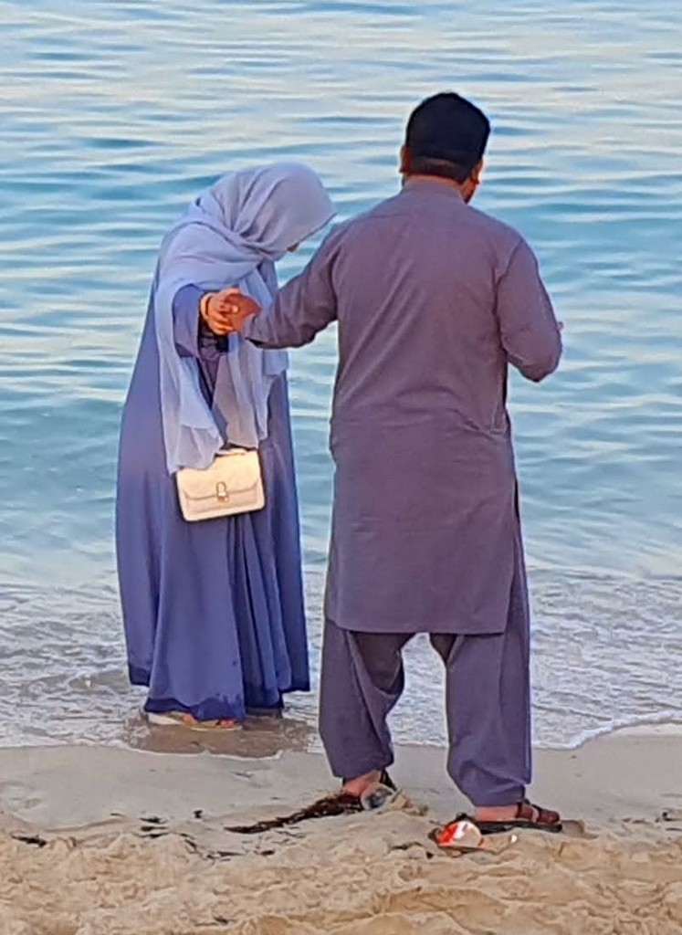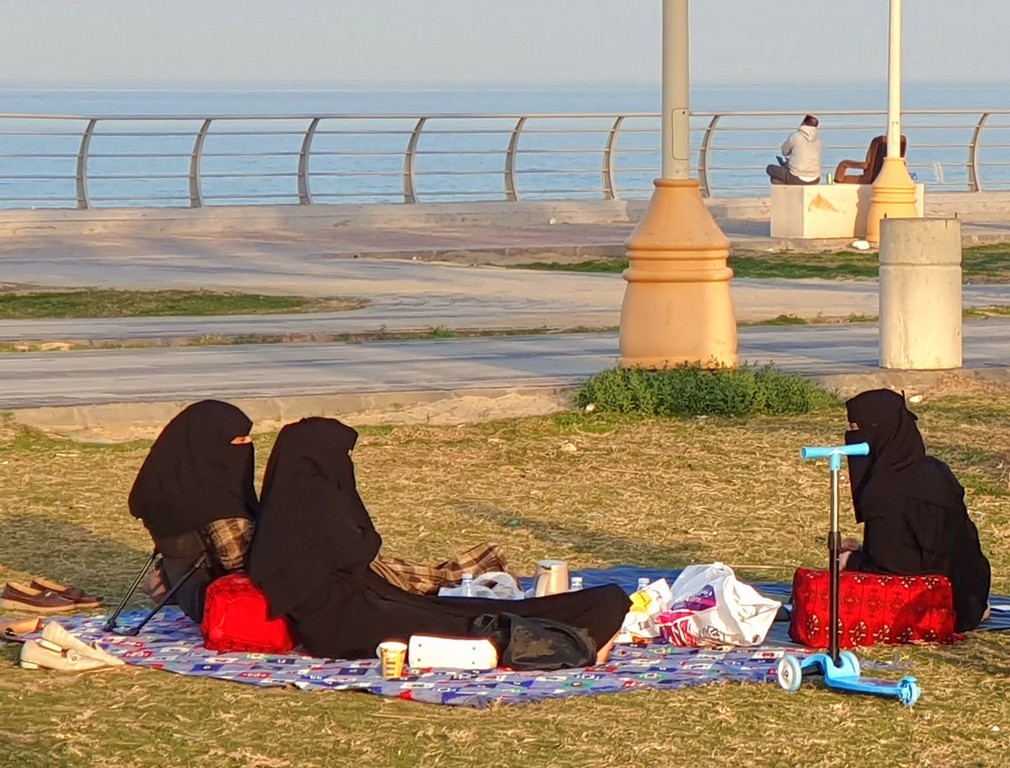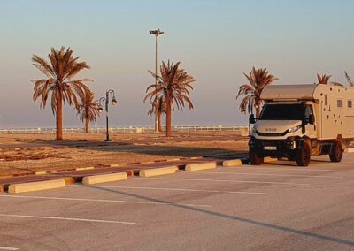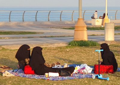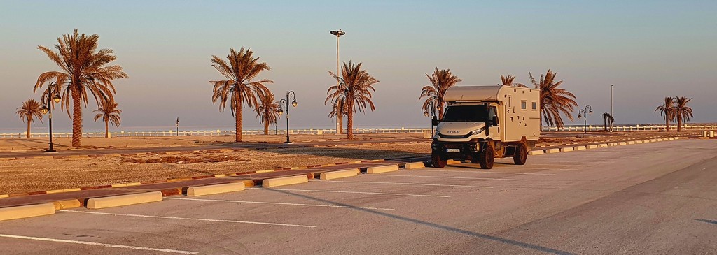 Wir machen Halt in Ras Tanurah in einem riesigen Park, um zu übernachten. Was wir sehen, erinnert uns an den Iran. Die Männer fischen, die Frauen sitzen in Gruppen unter schattenspendenden Überdachungen. Und es wird getratscht, gelacht, gegessen und unsere Ankunft wird mit neugierigen Blicken beobachtet. Kaum haben wir unsere Panoramaklappe geöffnet, schauen uns sechs neugierige und fragende Augen an. Schnell beginnt ein Kreuzverhör mit wenigen englischen Worten. Woher, wohin, was wir hier überhaupt tun. Wir kommen kaum mit dem Beantworten der Fragen nach, als wir bereits die erste Einladung bekommen. Nicht ganz ungelegen, da wir Hunger von der mehrstündigen Fahrt haben. Und die Fragen nehmen kein Ende. Die Frauen und Männer in Gruppen getrennt ist für uns noch ungewohnt. Corinne darf an die Frauengruppen herantreten. Ich bleibe in respektvollem Abstand etwas abseits stehen. Wo ich doch so einen Hunger habe. Doch dann schauen mich mehrere hübsche braune Augen aus ihrem Sehschlitz an und bieten mir ebenso etwas Nahrhaftes an. Glück gehabt! Ich halte mich weiterhin im Hintergrund, während Frau Capitano eifrig kommuniziert.