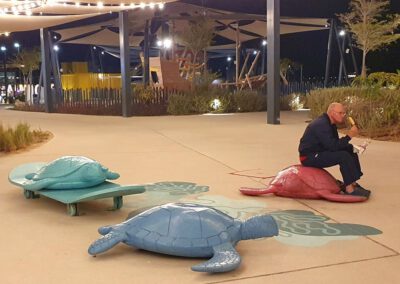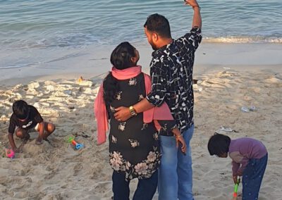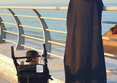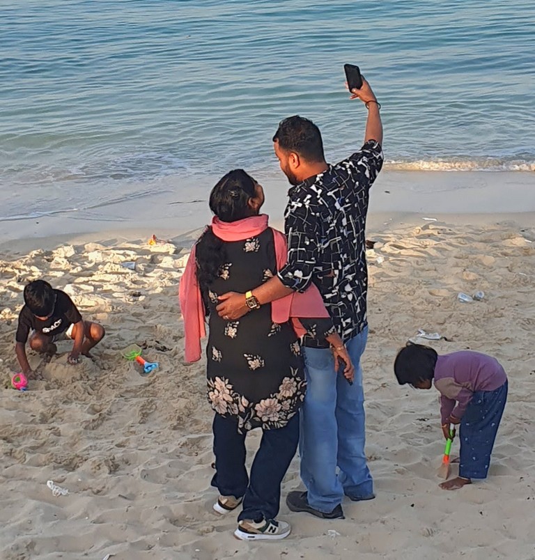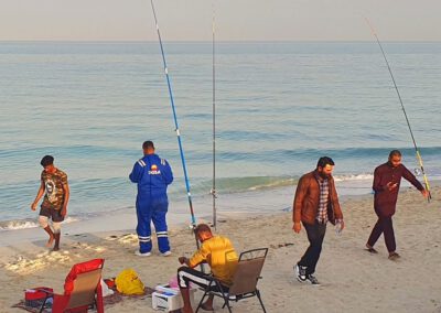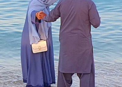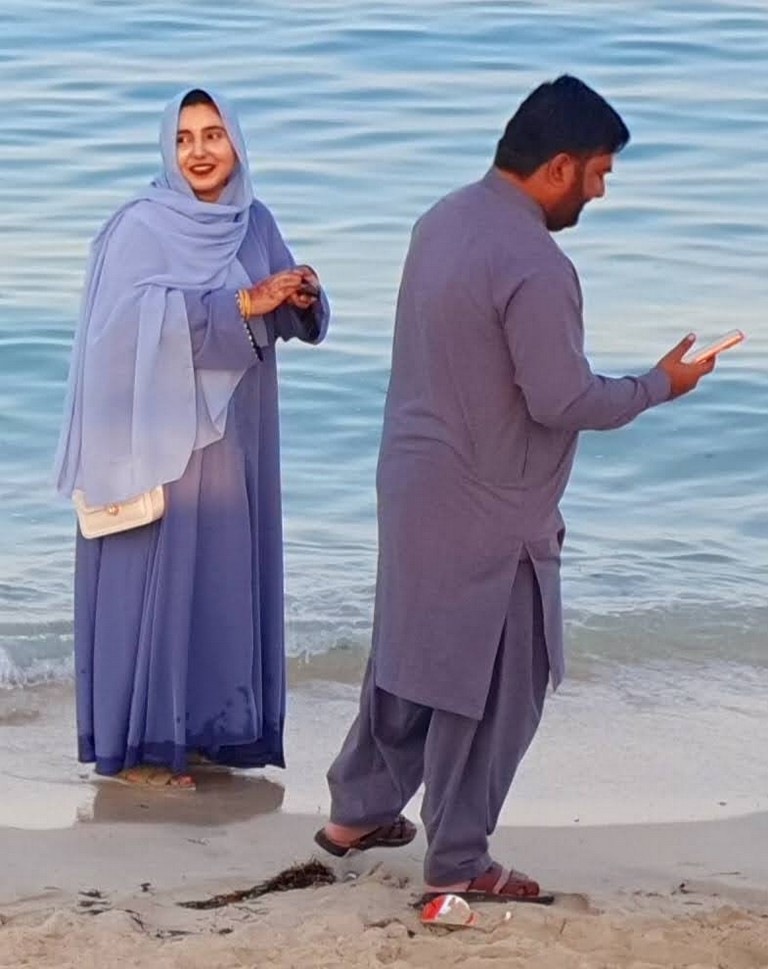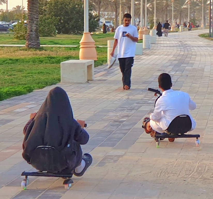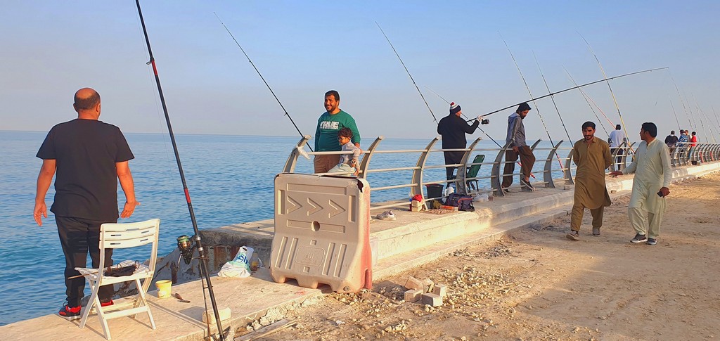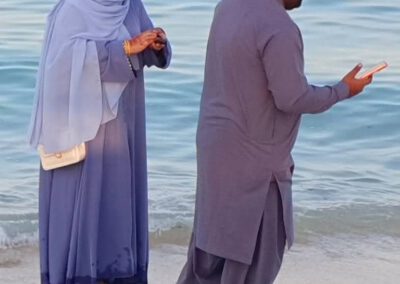 Wir machen Halt in Ras Tanurah in einem riesigen Park, um zu übernachten. Was wir sehen, erinnert uns an den Iran. Die Männer fischen, die Frauen sitzen in Gruppen unter schattenspendenden Überdachungen. Und es wird getratscht, gelacht, gegessen und unsere Ankunft wird mit neugierigen Blicken beobachtet. Kaum haben wir unsere Panoramaklappe geöffnet, schauen uns sechs neugierige und fragende Augen an. Schnell beginnt ein Kreuzverhör mit wenigen englischen Worten. Woher, wohin, was wir hier überhaupt tun. Wir kommen kaum mit dem Beantworten der Fragen nach, als wir bereits die erste Einladung bekommen. Nicht ganz ungelegen, da wir Hunger von der mehrstündigen Fahrt haben. Und die Fragen nehmen kein Ende. Die Frauen und Männer in Gruppen getrennt ist für uns noch ungewohnt. Corinne darf an die Frauengruppen herantreten. Ich bleibe in respektvollem Abstand etwas abseits stehen. Wo ich doch so einen Hunger habe. Doch dann schauen mich mehrere hübsche braune Augen aus ihrem Sehschlitz an und bieten mir ebenso etwas Nahrhaftes an. Glück gehabt! Ich halte mich weiterhin im Hintergrund, während Frau Capitano eifrig kommuniziert.