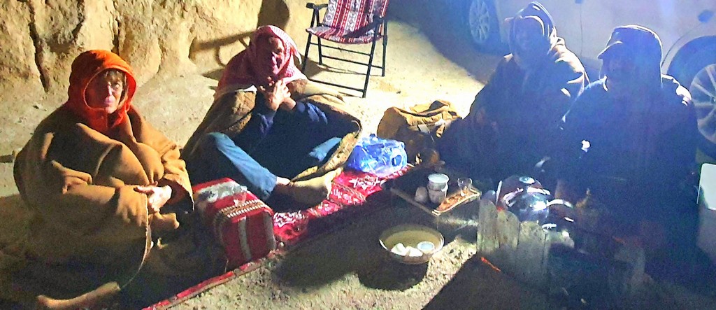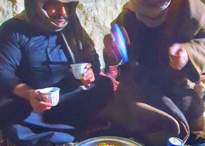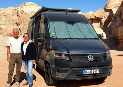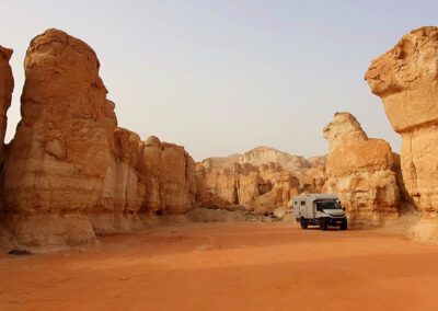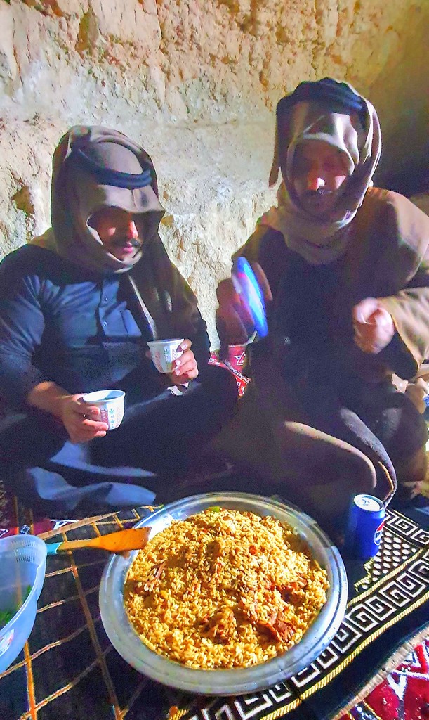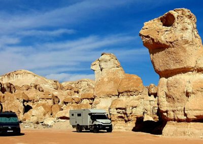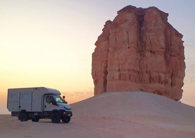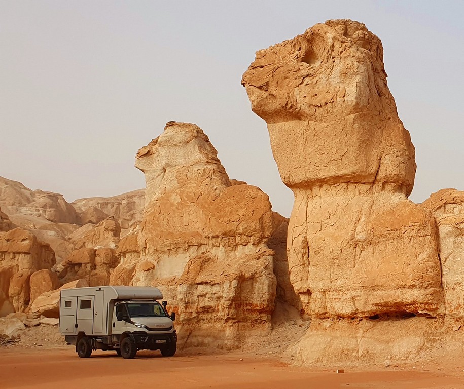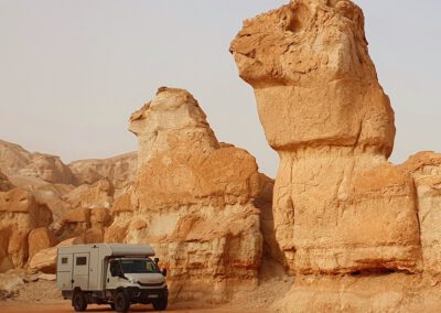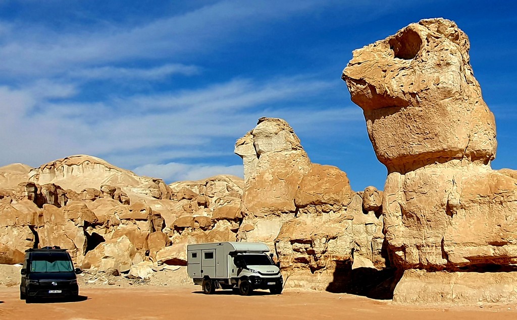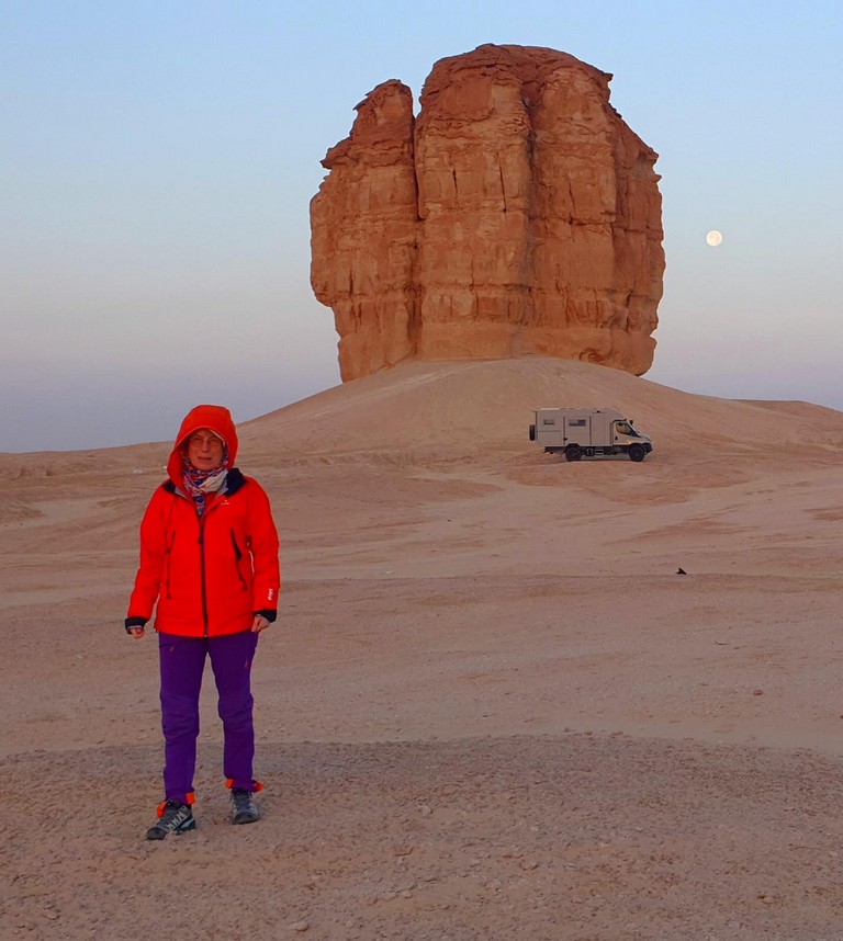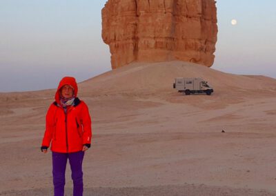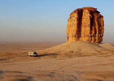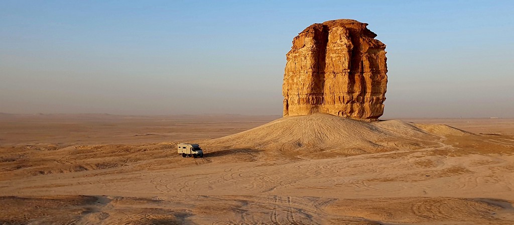 Der Judah’s Thumb ruft. Ein in der Wüste isoliert stehender Felsklotz. Schon in Sichtweite müssen wir die letzten 15 Kilometer über eine rauhbeinige Piste hoppeln, bevor wir unser Ziel erreichen. Imposant, beeindruckend. Kaum sind die letzten Guides mit den Touris verschwunden, machen wir es uns gemütlich, als wir draußen Stimmen wahrnehmen. „How are you? Please be our guests.“ Wir führen ausschweifende Gespräche mit Händen und Füßen, „google translator “ und sonstigen kommunikativen Hilfsmitteln. Wir müssen bleiben, es gibt Kamelfleisch mit Reis – aber leider ohne Besteck. Es wird mit Fingern gegessen. So ist das hier üblich. Auch daran müssen wir uns erst noch gewöhnen. Andere Länder, andere Sitten. Wir werden verwöhnt, befragt und lernen so die herzliche arabische Gastfreundschaft kennen. Auch das ist nur möglich als Overlander und am besten zu zweit.