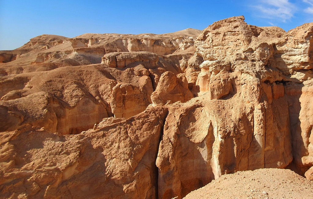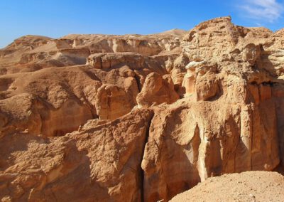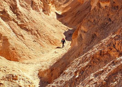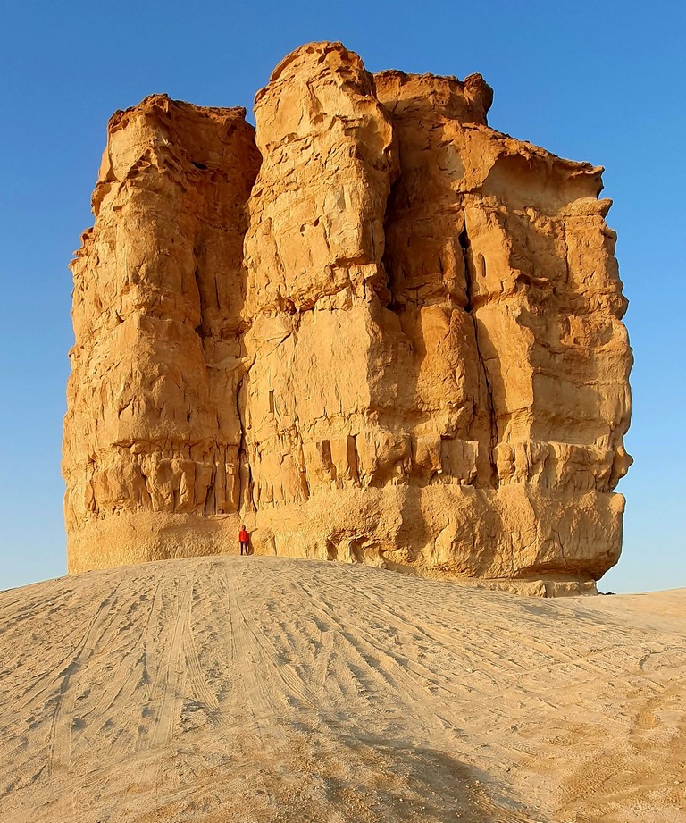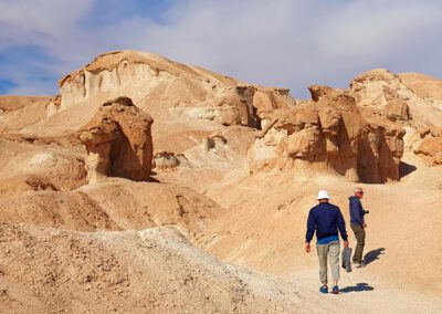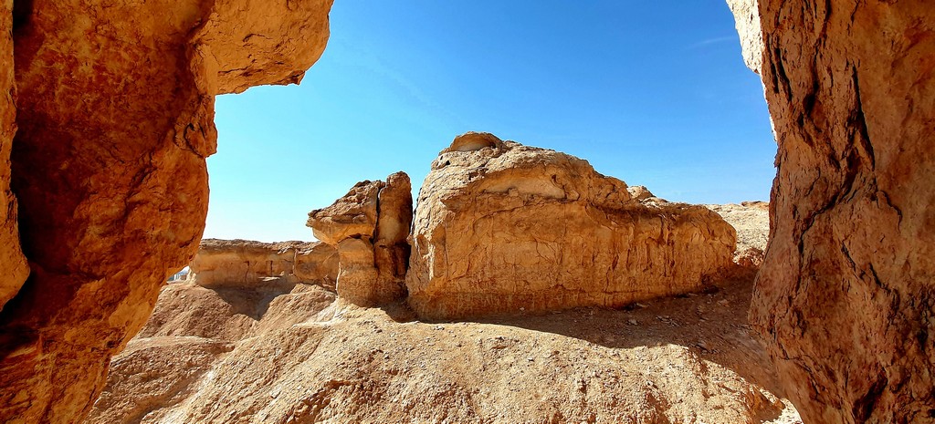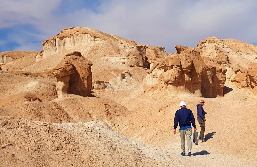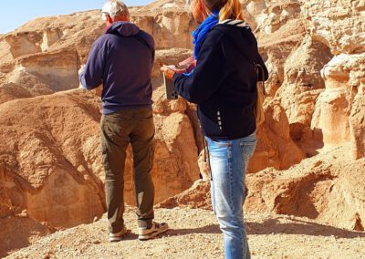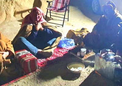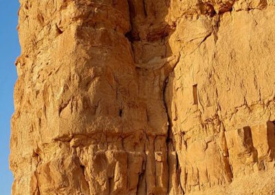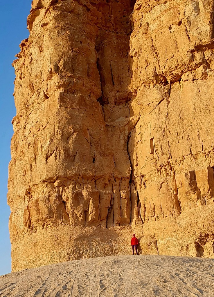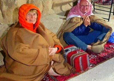 Der Judah’s Thumb ruft. Ein in der Wüste isoliert stehender Felsklotz. Schon in Sichtweite müssen wir die letzten 15 Kilometer über eine rauhbeinige Piste hoppeln, bevor wir unser Ziel erreichen. Imposant, beeindruckend. Kaum sind die letzten Guides mit den Touris verschwunden, machen wir es uns gemütlich, als wir draußen Stimmen wahrnehmen. „How are you? Please be our guests.“ Wir führen ausschweifende Gespräche mit Händen und Füßen, „google translator “ und sonstigen kommunikativen Hilfsmitteln. Wir müssen bleiben, es gibt Kamelfleisch mit Reis – aber leider ohne Besteck. Es wird mit Fingern gegessen. So ist das hier üblich. Auch daran müssen wir uns erst noch gewöhnen. Andere Länder, andere Sitten. Wir werden verwöhnt, befragt und lernen so die herzliche arabische Gastfreundschaft kennen. Auch das ist nur möglich als Overlander und am besten zu zweit.