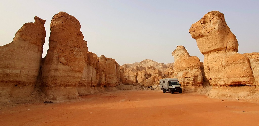 Am nächsten Tag erreichen wir Hofuf, eine kleine Stadt. Wir besichtigen Höhlen und die Hofuf-Burg und kommen abends an unseren Abstellplatz. War das nicht eben ein deutsches Auto? Ein Kastenwagen. Kaum angehalten, stellen wir uns vor. Es sind Ursula und Gereon aus Düsseldorf. Endlich mal wieder deutsch reden! Tut auch mal gut. Wir verbringen gemeinsame und herrliche Stunden.