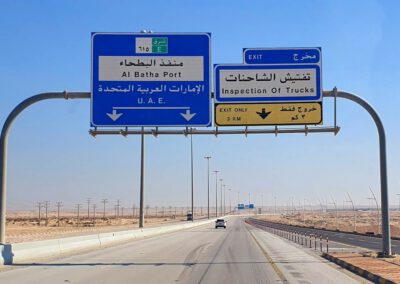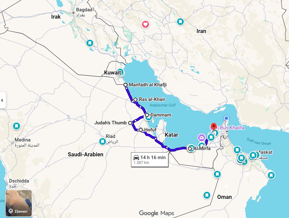 Weiterfahrt von Hofuf über Al Batha und nach dem Grenzübertritt Saudi Arabien – VAE über Al Mirfa nach Dubai