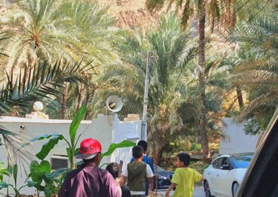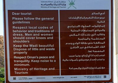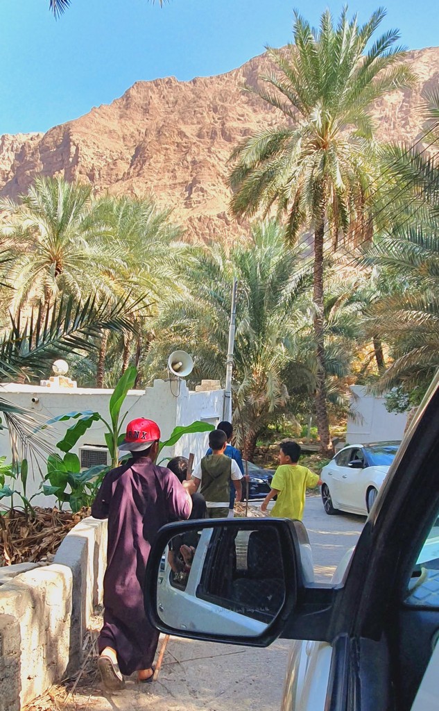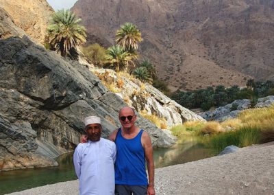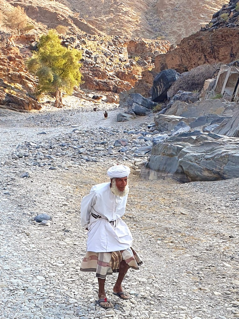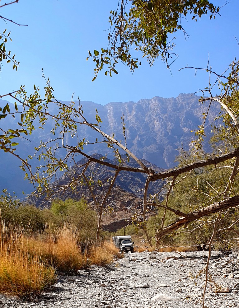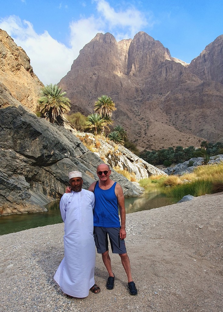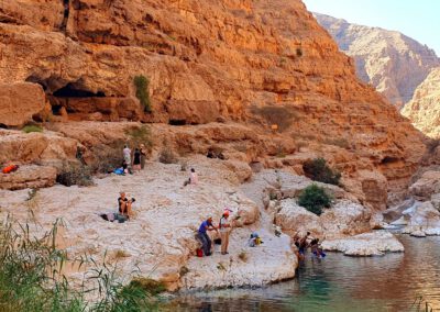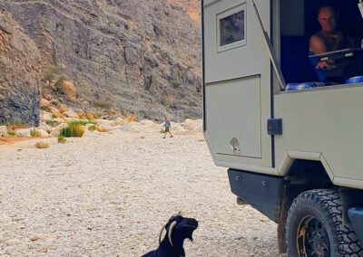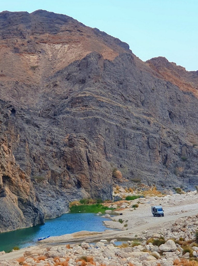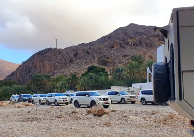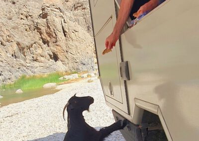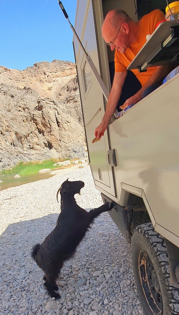 Am Talboden des Wadi Arbeieen kommen wir zur Ruhe und können erst mal wieder durchschnaufen. Wären da nicht mindestens 15 SUV`s beladen mit Touristen. Und dazu auch noch mit Deutschen, die direkt von „Mein Schiff“ kommen zu einem Ausflug hierher. Wir sind es gar nicht mehr gewohnt mit so vielen Deutschen zu reden, und wir spüren, daß diese Art ein Land zu bereisen so gar nicht unser Ding ist. Wir lieben das Abenteuer und die Mischung von Einsamkeit, Wildnis und den landeseigenen Menschen mit ihrer für uns fremdartigen Kultur. Es vergeht kein Tag, an dem wir nicht von den Omanis angesprochen und oft auch eingeladen werden.