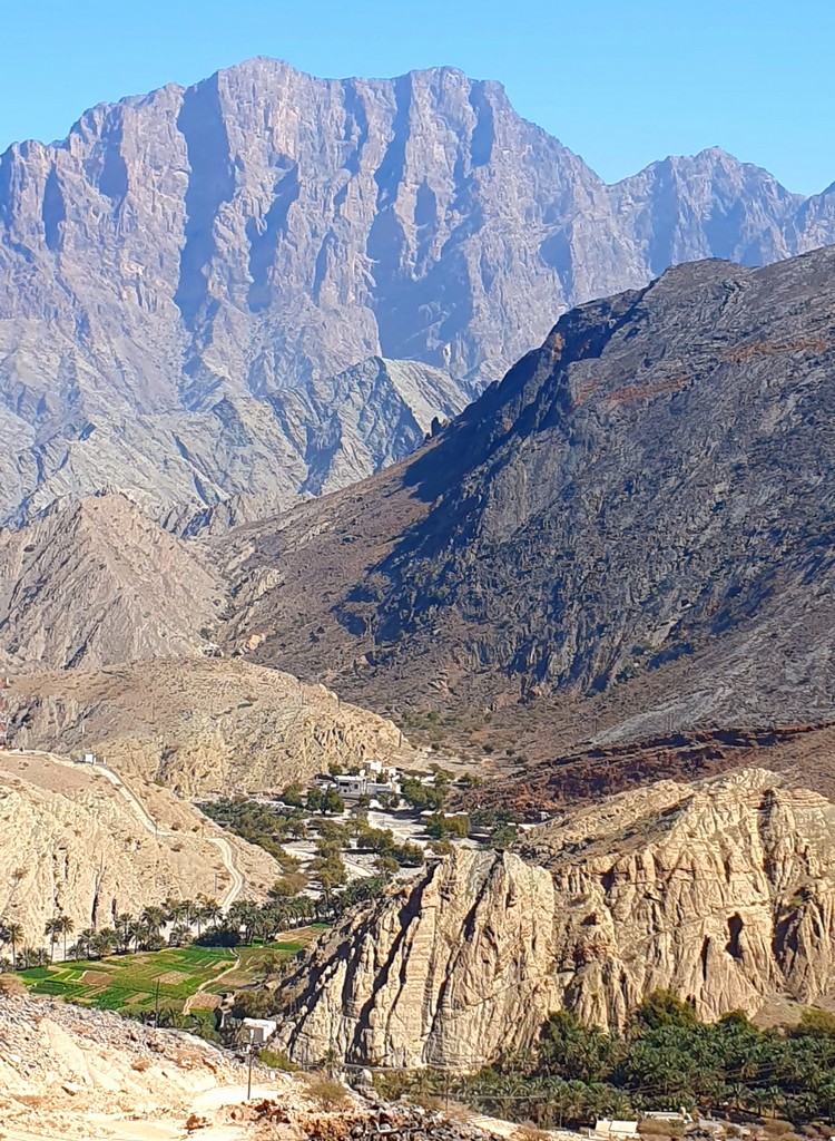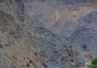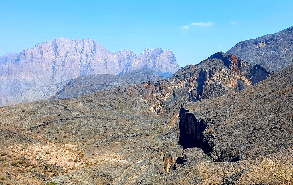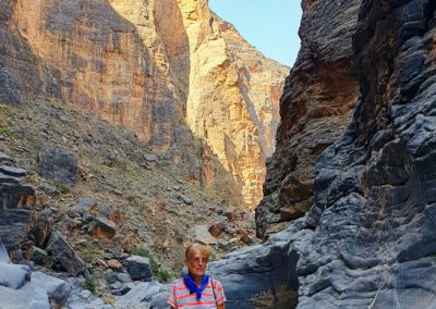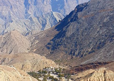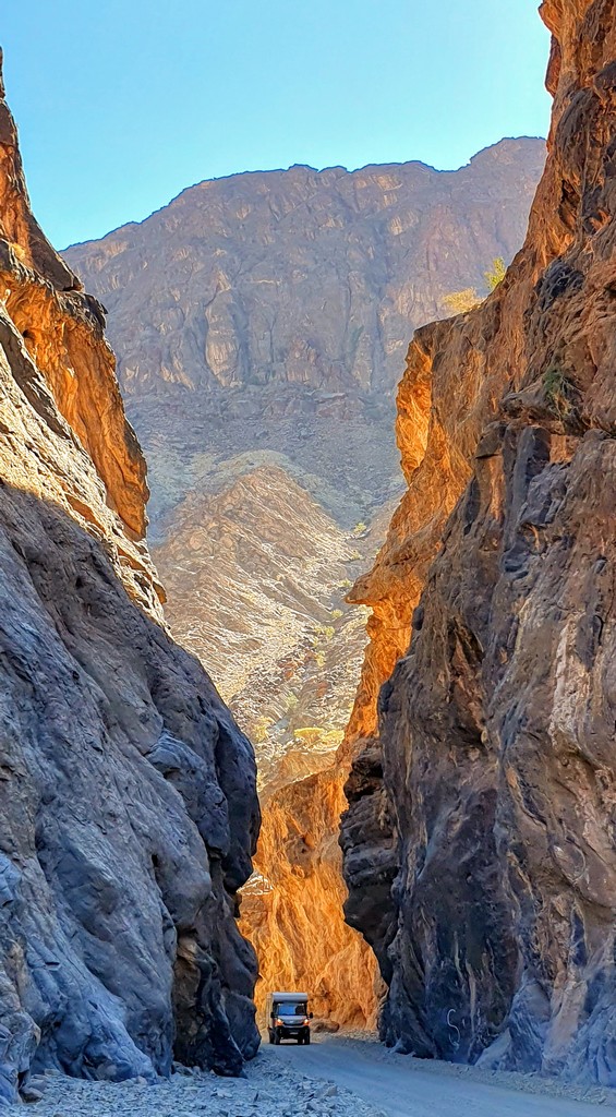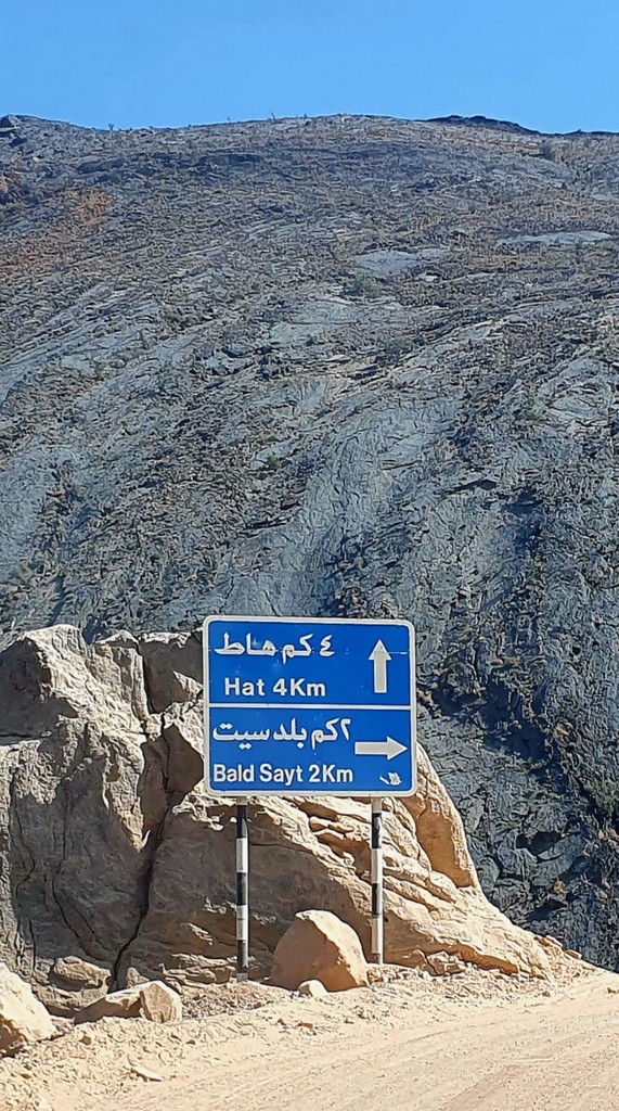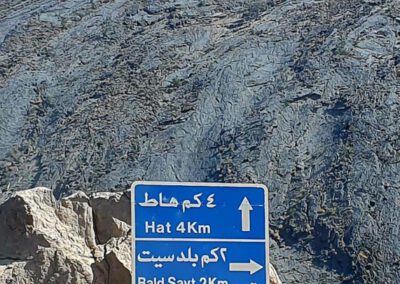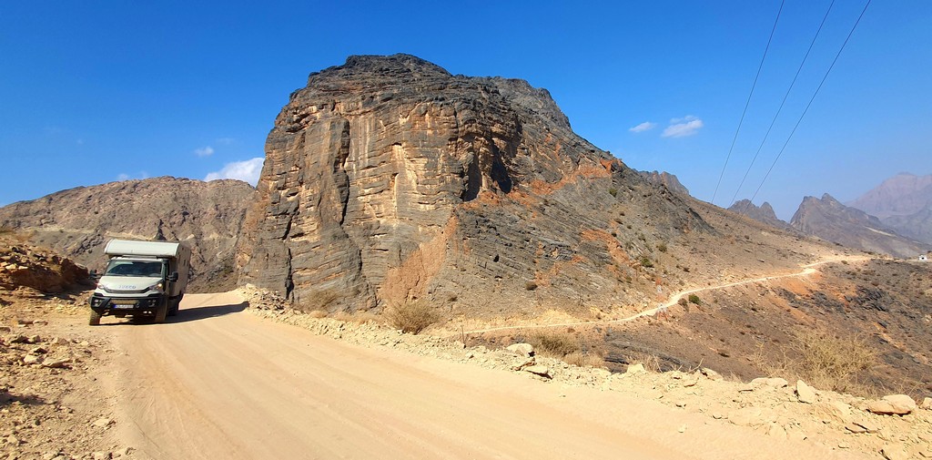 Das Wadi Hoqain ist unser erstes Wadi, das wir besuchen, dann folgt der „Little Snake Canyon“ und dann sollte die Piste über den großen „Snake Canyon“ über das Dorf Bald Sait (auch Bilad Sayt genannt) hoch zum über 2.000 m hohen Berg Jabal Hat kommen. Wir beherzigen einige fahrtechnische Besonderheiten und Karli bringt uns treu und sicher an unsere Ziele. Berge mit Steigungen und Gefälle mit teilweise über 30% erfordert hochkonzentriertes Fahren. Erst in der Ortschaft Bald Sait oberhalb vom „Snake Canyon“ werden wir von den Einheimischen eingebremst. „Don’t do it. It’s too dangerous with such a big car.“ Es ist wohl eine sehr enge und sehr, sehr steile Piste, knapp 10 km lang mit einem Höhenanstieg von 1.300 m. Leider müssten wir diese auch noch hoch fahren. Letzendlich hören wir auf die Einheimischen und brechen an dieser Stelle die Durchquerung des Gebirges über den 2.050 m hohen Berg Jabal Hat ab. In einigen Wochen wollen wir das Hajar-Gebirge von Süden aus erkunden, wenn wir von Salalah nach Norden fahren. Aufgeschoben ist nicht aufgehoben.