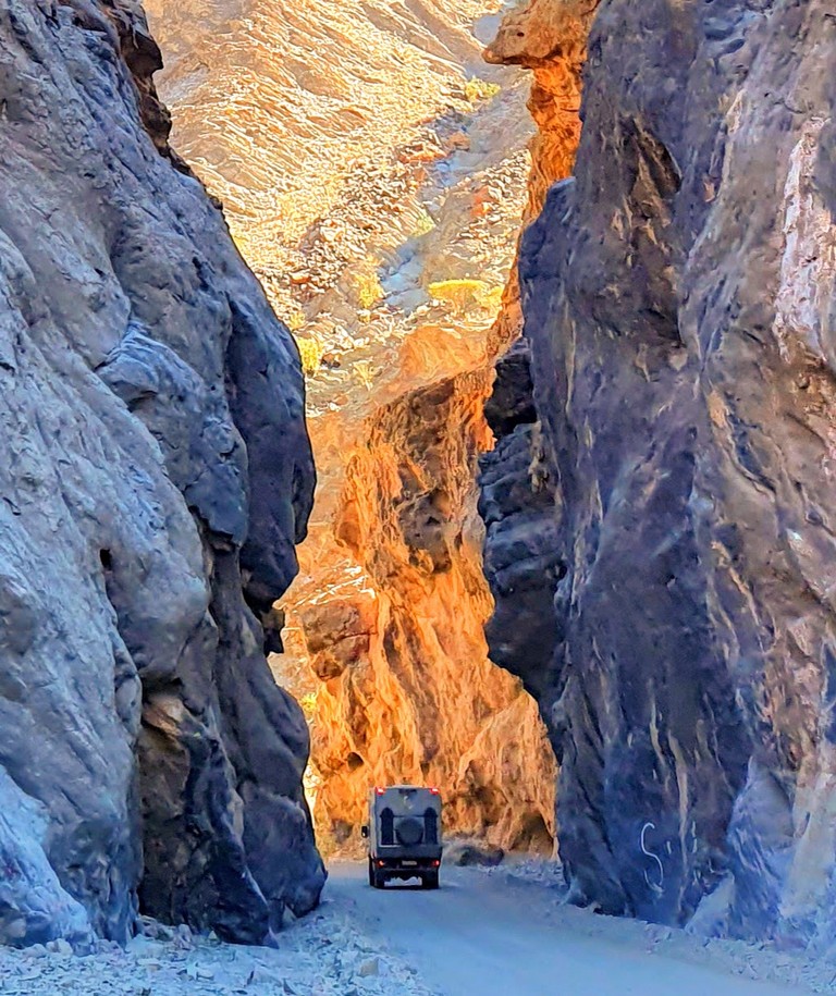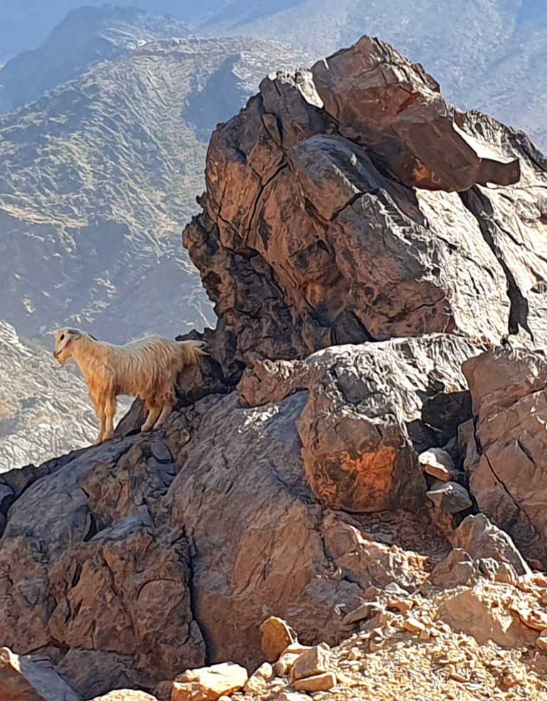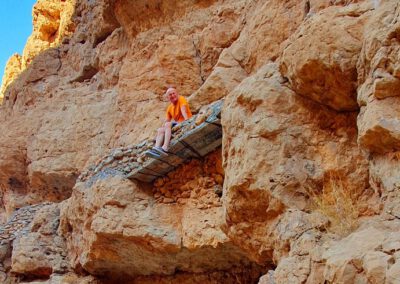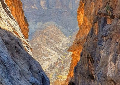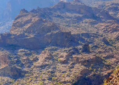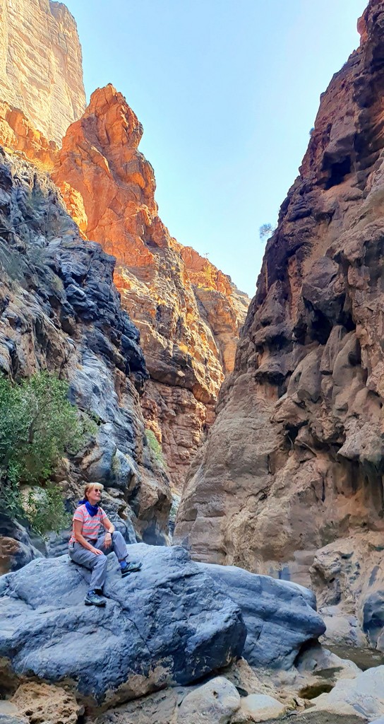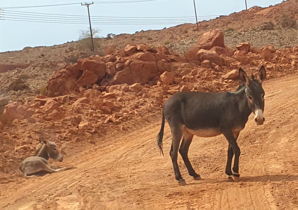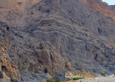 Das Wadi Hoqain ist unser erstes Wadi, das wir besuchen, dann folgt der „Little Snake Canyon“ und dann sollte die Piste über den großen „Snake Canyon“ über das Dorf Bald Sait (auch Bilad Sayt genannt) hoch zum über 2.000 m hohen Berg Jabal Hat kommen. Wir beherzigen einige fahrtechnische Besonderheiten und Karli bringt uns treu und sicher an unsere Ziele. Berge mit Steigungen und Gefälle mit teilweise über 30% erfordert hochkonzentriertes Fahren. Erst in der Ortschaft Bald Sait oberhalb vom „Snake Canyon“ werden wir von den Einheimischen eingebremst. „Don’t do it. It’s too dangerous with such a big car.“ Es ist wohl eine sehr enge und sehr, sehr steile Piste, knapp 10 km lang mit einem Höhenanstieg von 1.300 m. Leider müssten wir diese auch noch hoch fahren. Letzendlich hören wir auf die Einheimischen und brechen an dieser Stelle die Durchquerung des Gebirges über den 2.050 m hohen Berg Jabal Hat ab. In einigen Wochen wollen wir das Hajar-Gebirge von Süden aus erkunden, wenn wir von Salalah nach Norden fahren. Aufgeschoben ist nicht aufgehoben.