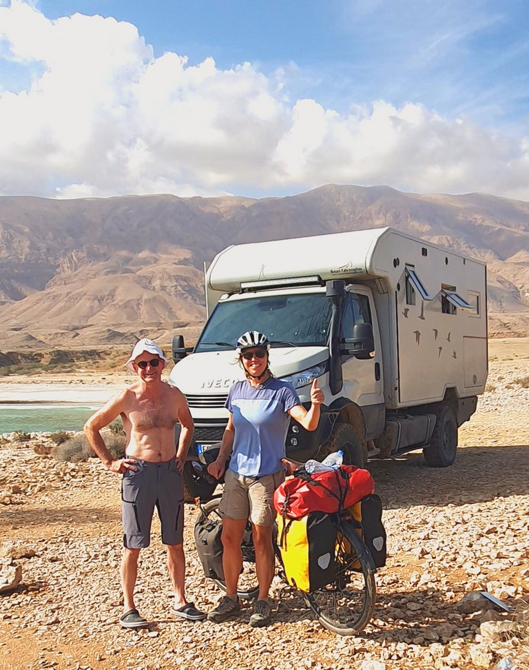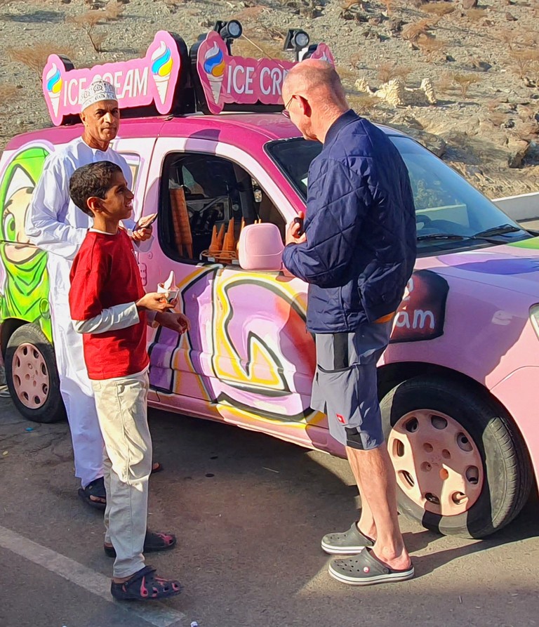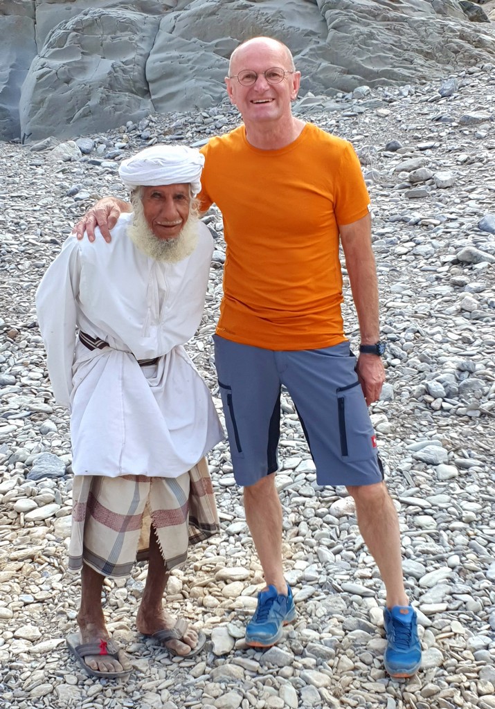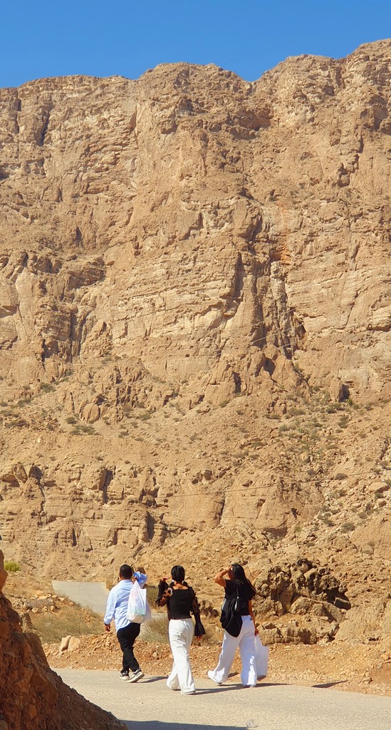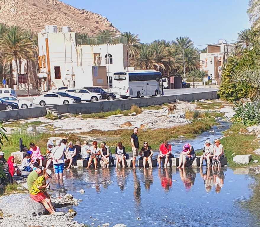 Doch da gibt es eine Ausnahme. Da steht doch zwischen den Deutschen ein Girl wie aus dem Nichts. Mit Fahrradhelm und Sportklamotten bekeidet spüren wir, daß sie nicht zu diesen Touristen gehört. Und wie der Zufall es will. sie kommt aus Speyer, meiner Heimatstadt und kennt sogar meine Schwester. 10.000 km entfernt im fernen Oman. Welch ein Zufall. Wir verbringen nette Stunden mit Ursel aus Speyer. Sie hat sich für 18 Monate eine Auszeit genommen, ist am 1. Mai 2025 von zu Hause gestartet und bereist mit ihrem Fahrrad verschiedenste Länder. In Speyer wollen wir uns im nächsten Jahr dann mal treffen.