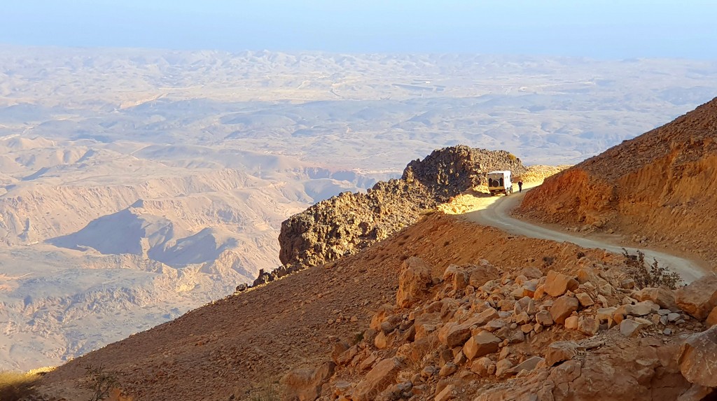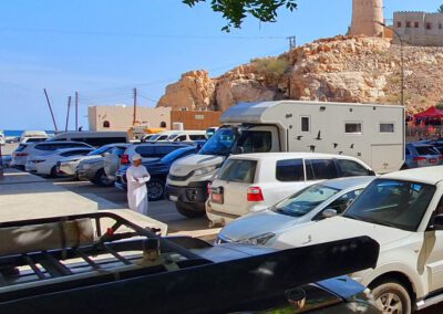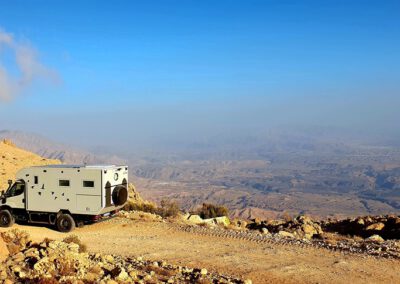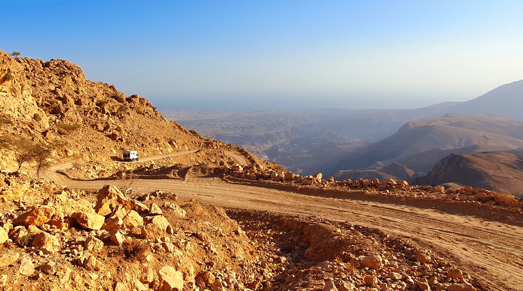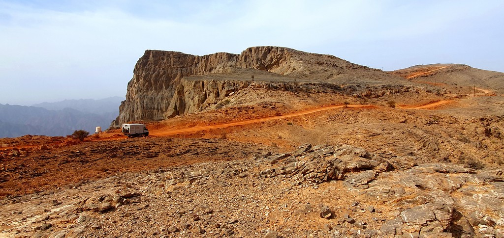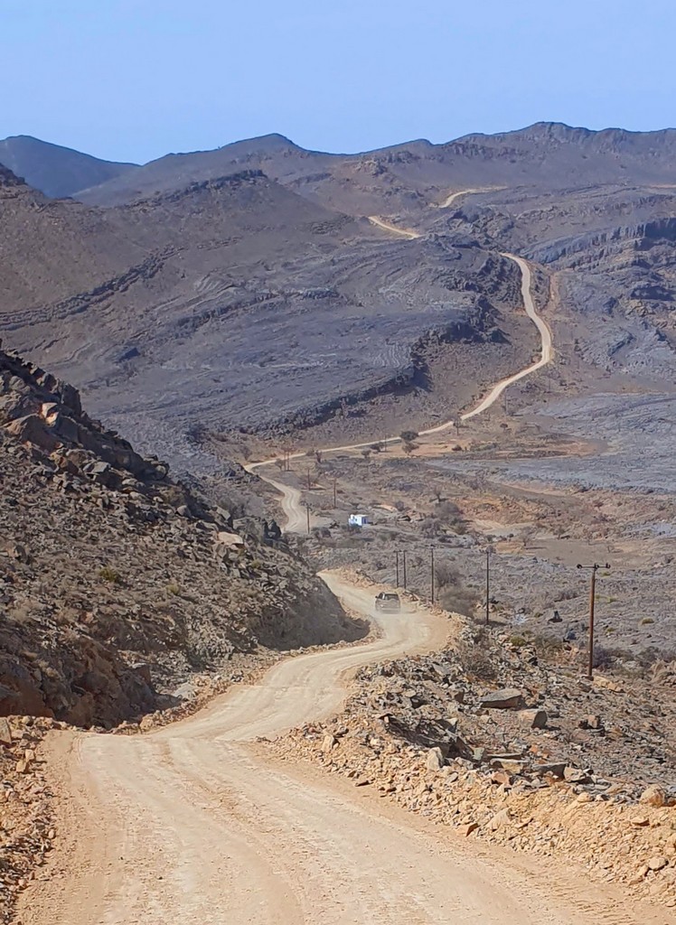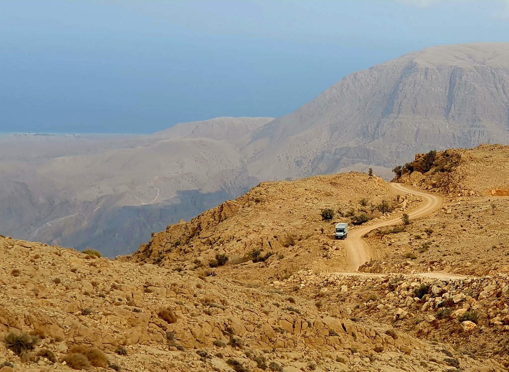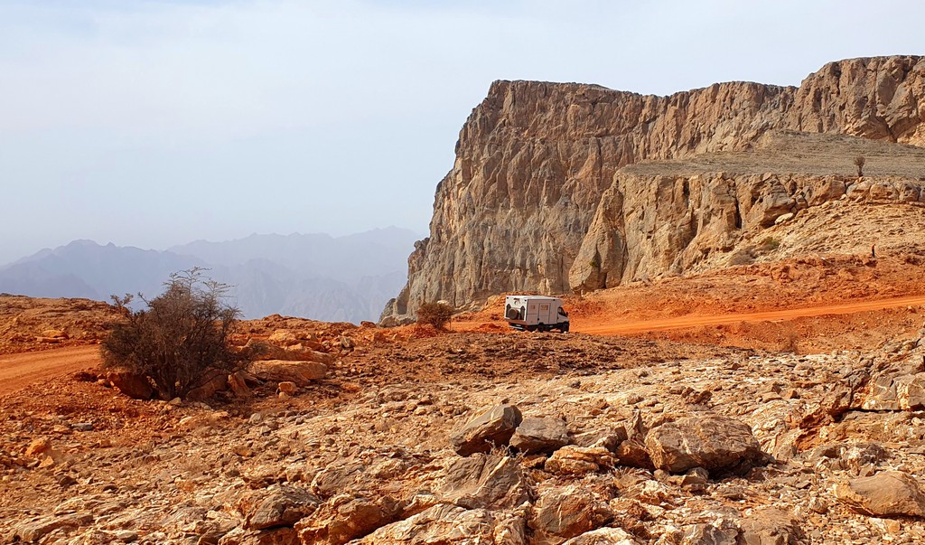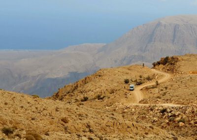 Vom Landesinneren und den Ausläufern des Hajar-Gebirges wollen wir über das „Salmah Plateau“ zur Küste am indischen Ozean. Wir fahren eine magisch anziehende Piste und treffen an einem Tag auf lediglich zwei Menschen. Oft fragen wir uns, wie und von was die Einheimischen hier in dieser gottverlassenen Gegend leben. Und dennoch machen sie einen zufriedenen und ausgeglichenen Eindruck. Wir kommen häufig ins Nachdenken. Die Piste ist wahnsinnig schön und naturbelassen. An einem tollen Aussichtspunkt suchen wir unseren Übernachtungsplatz. Weit über hundert Kilometer können wir an einer steil abfallenden Felswand bis zum ersehnten Meer sehen. Doch dann wird der Wind stärker und stärker. Karli steht an der Kante und unter uns fällt die Wand 200 m steil ab. Das Fahrzeug wackelt und ist unruhig wie nie zuvor. Zwischenzeitlich ist es dunkel. Ich begebe mich in dem Sturm nach außen, um alles zu überprüfen und einen Alternativplatz ausfindig zu machen. Ich kann kaum gegen den Wind angehen. Einen anderen Platz anzufahren bei Dunkelheit – zu gefährlich. Es vergehen bange Stunden und wir reden fast kein Wort. Wir fühlen uns in einer beklemmenden Situation. An Schlaf ist nicht zu denken. Erst am frühen Morgen lässt der Wind etwas nach und mit dem ersten Tageslicht verlassen wir unseren Nachtplatz und fahren eine steile Piste ins Tal.