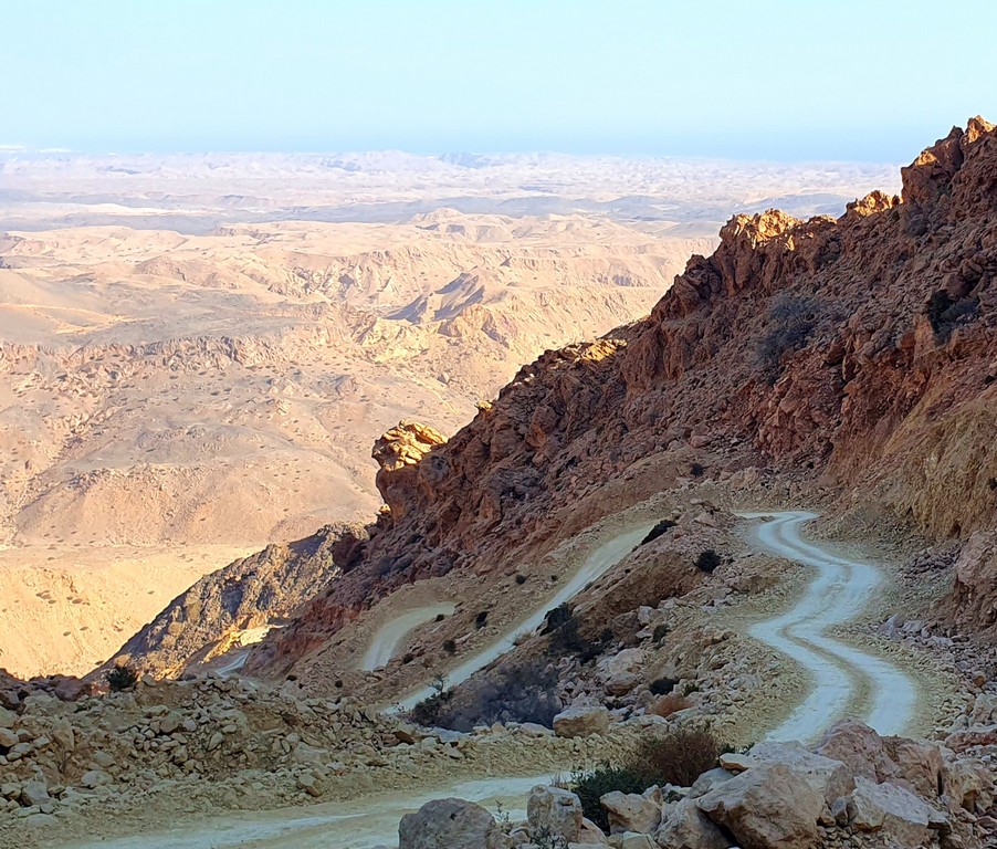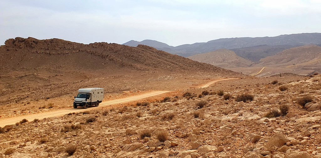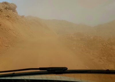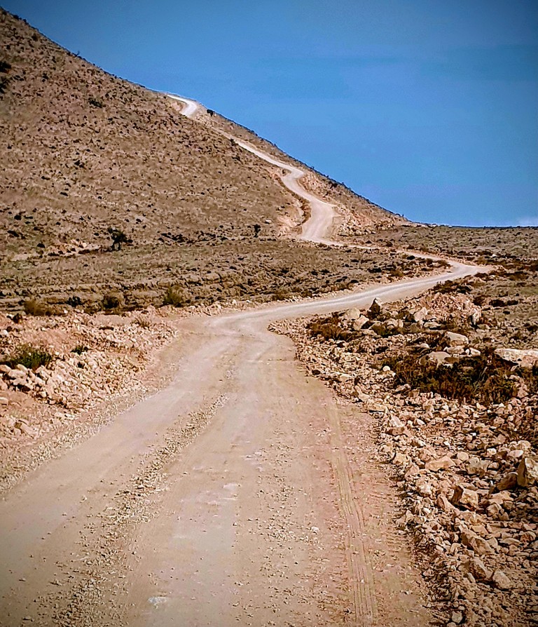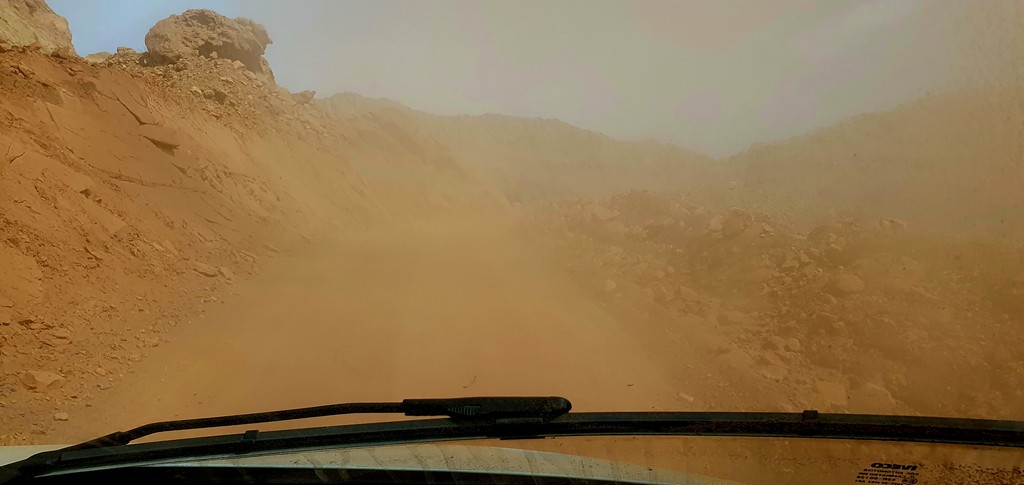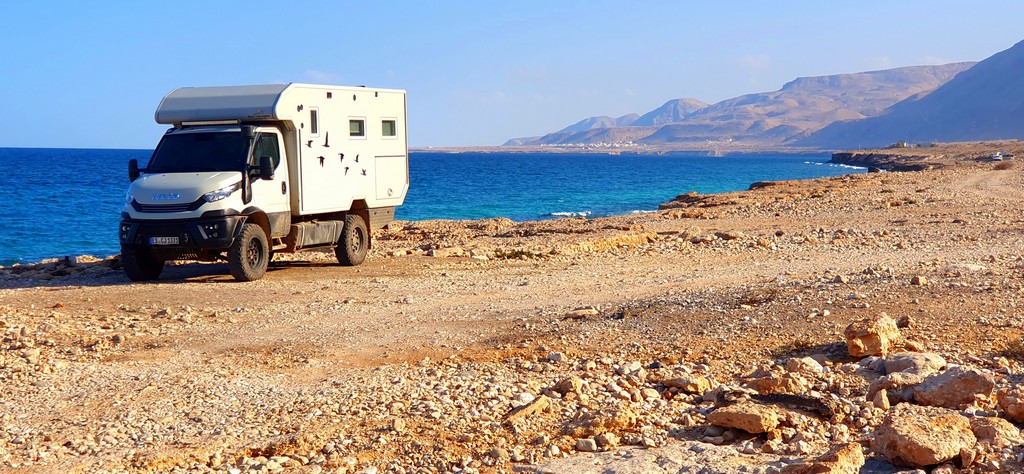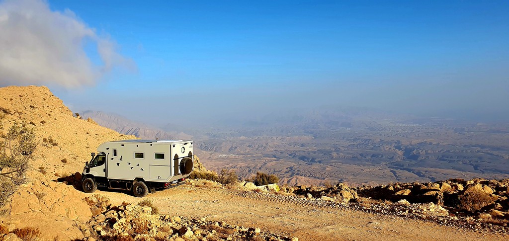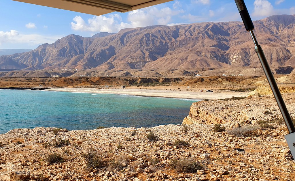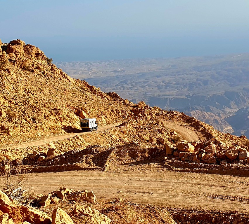 Vom Landesinneren und den Ausläufern des Hajar-Gebirges wollen wir über das „Salmah Plateau“ zur Küste am indischen Ozean. Wir fahren eine magisch anziehende Piste und treffen an einem Tag auf lediglich zwei Menschen. Oft fragen wir uns, wie und von was die Einheimischen hier in dieser gottverlassenen Gegend leben. Und dennoch machen sie einen zufriedenen und ausgeglichenen Eindruck. Wir kommen häufig ins Nachdenken. Die Piste ist wahnsinnig schön und naturbelassen. An einem tollen Aussichtspunkt suchen wir unseren Übernachtungsplatz. Weit über hundert Kilometer können wir an einer steil abfallenden Felswand bis zum ersehnten Meer sehen. Doch dann wird der Wind stärker und stärker. Karli steht an der Kante und unter uns fällt die Wand 200 m steil ab. Das Fahrzeug wackelt und ist unruhig wie nie zuvor. Zwischenzeitlich ist es dunkel. Ich begebe mich in dem Sturm nach außen, um alles zu überprüfen und einen Alternativplatz ausfindig zu machen. Ich kann kaum gegen den Wind angehen. Einen anderen Platz anzufahren bei Dunkelheit – zu gefährlich. Es vergehen bange Stunden und wir reden fast kein Wort. Wir fühlen uns in einer beklemmenden Situation. An Schlaf ist nicht zu denken. Erst am frühen Morgen lässt der Wind etwas nach und mit dem ersten Tageslicht verlassen wir unseren Nachtplatz und fahren eine steile Piste ins Tal.