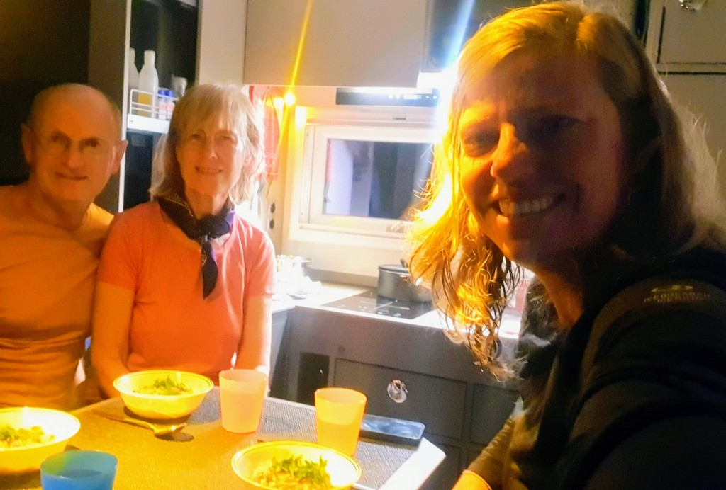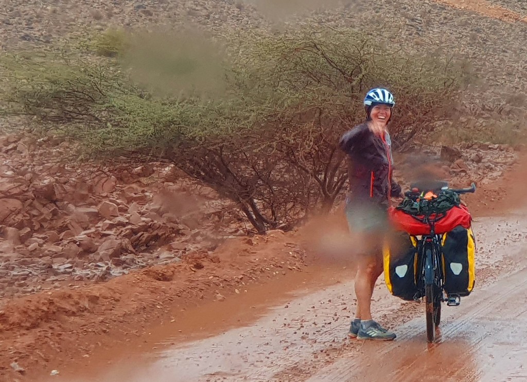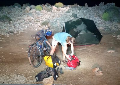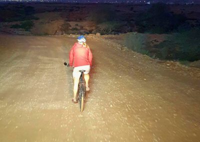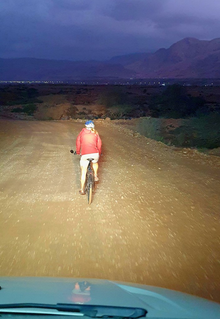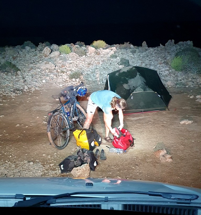 Als wir am Fins Beach an einer Klippe am Meer stehen, meldet sich Ursel. Sie ist nur noch 20 km von uns entfernt und will uns besuchen. Nach einer Stunde ist sie in Sichtweite. Dummerweise trennt uns ein Canyon. Mittlerweile dämmert es, Ursel ist etwas genervt und entkräftet. Wir verlassen ganz schnell unseren Standplatz und vereinbaren einen Treffpunkt zu Beginn einer Piste. Als wir sie treffen, ist es stockdunkel. Ihr Gepäck kommt in Karli und im Licht unserer Pistenbeleuchtung von Karli radelt Ursel mit uns als Begleitschutz zu unserem Übernachtungsplatz. Ende gut – alles gut.