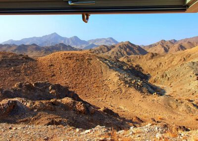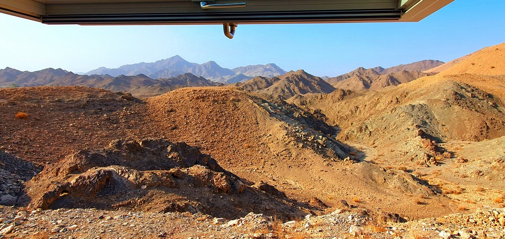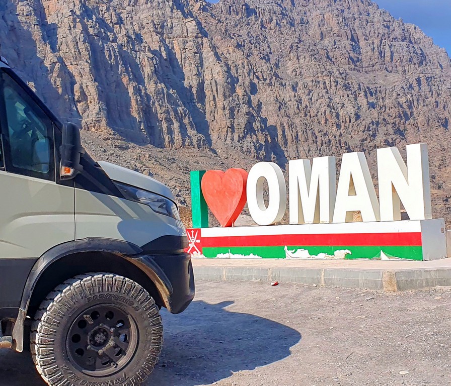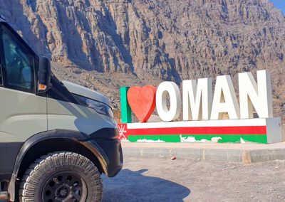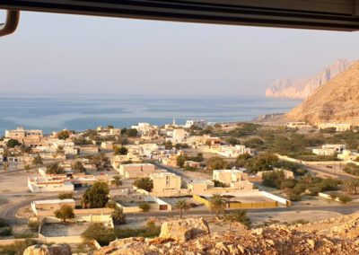 Wenn schon – denn schon. Wir beginnen mit unserer Omanreise am nördlichsten Zipfel. Musandam. Eine Enklave am nördlichsten Punkt der arabischen Halbinsel. Hier ist auch die Meerenge zwischen dem persischen Golf und dem Golf von Oman. Eine strategisch wichtige Zone sowohl in der Vergangenheit, als auch in dieser unruhigen Zeit, in der die Weltmächte die Muskeln spielen lassen. Wir besuchen tolle Aussichtspunkte und beschließen, die Grenze nach VAE über die Grenze bei Dibba zu nehmen. Dazu muss eine Berg-Piste bewältigt werden, die nicht ganz ohne ist. Wir müssen uns dazu die Erlaubnis bei der Stadtbehörde und Polizei von Khasab besorgen. Wir sind fest entschlossen und so nehmen wir die fünf Stunden Warte- und Bearbeitungszeit in Kauf. Kaum auf der Piste angekommen, zickt nach 3 – 4 km Karli. BDVI-Alarm. Zu deutsch: Das Verteilergetriebe ist zu heiß und kommt an seine Grenzen. Zumindest sagen das die Sensoren. Wir müssen anhalten. Dann kommt der Fehler „Getriebe defekt“ und das Getriebe kuppelt aus. In der schmalen steilen Piste rollt das Fahrzeug trotz gezogener Handbremse rückwärts. Ich muss auf der Fußbremse bleiben, um Karli zum Stoppen zu bringen. Zum Wenden ist alles zu schmal und zu steil. Corinne muss aussteigen und sucht nach einem Platz zum Wenden. 200 m weiter oben gibt es einen winzigen Platz. Zündung aus, dann wieder an. Karli hat sich berappelt und fährt noch zu unserem rettenden Wendeplatz. Uns ist die Abenteuerlust vergangen und wir fahren noch leicht geschockt wieder abwärts. Wir beschäftigen uns mit diesem Alarm und belesen uns. Musandam verlassen wir über die übliche Teerstrasse mit neuen Erkenntnissen und Eindrücken.
