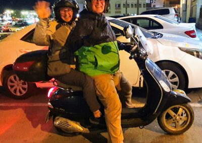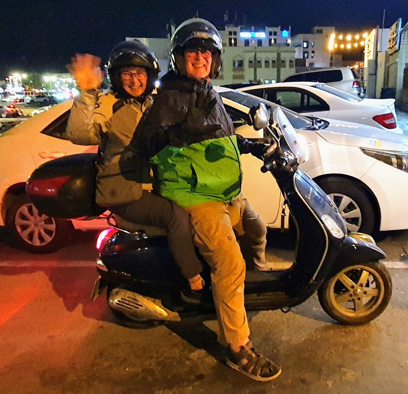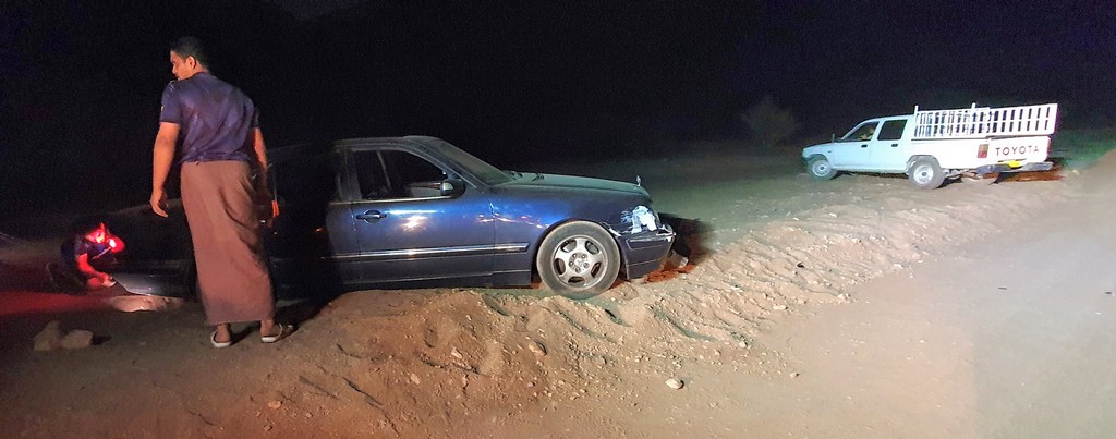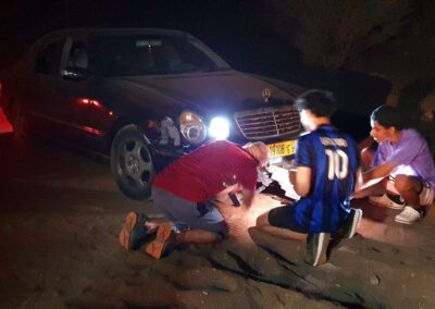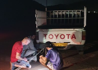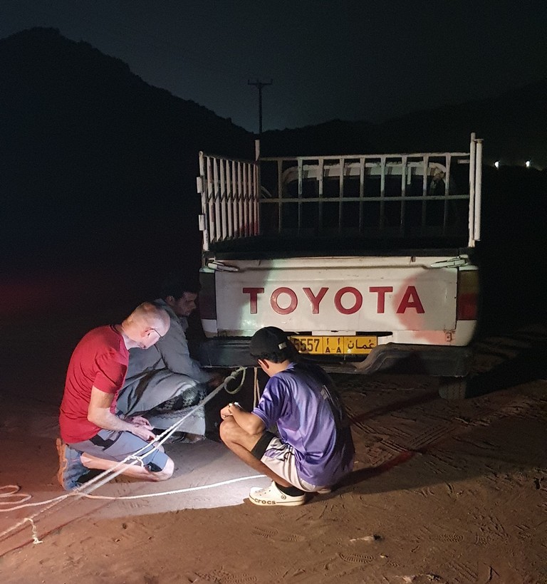 Am nächsten Tag starten wir zu einer Bergtour in der näheren Umgebung von Muscat. Wir lassen es ruhig angehen. Doch die Tour gestaltet sich schwieriger als gedacht. Corinne will bei der Mitte des Aufstiegs auf mich warten. Ich gehe weiter und komme nach anstrengenden 2 Stunden im Dunkeln wieder an unseren Ausgangspunkt. Zwischenzeitlich haben sich zwei Omanis mit ihrem Daimler im Sand festgefahren. Ihre Bergeversuche gestalten sich eher chaotisch als durchdacht. Die Folge: ein gerissenes Seil, eine herausgerissene Stoßstange und der Kerl sitzt immer noch fest. Jetzt soll Karli die beiden rausziehen. Anstelle einer aufwendigen Bergeaktion drück ich den beiden meine Sandschaufel in die Hand. Nach 10 Minuten Vorbereitung können wir mit vereinten Kräften den Daimler aus seiner misslichen Situation befreien. die Omanis freuen sich und bedanken sich vielfach. Endlich konnten wir mal etwas für unsere Gastgeber tun.