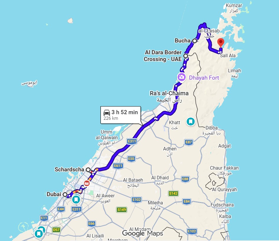 Von Dubai nach Musandam-Oman über Bukha, Khasab und Pistenfahrt in die Berge