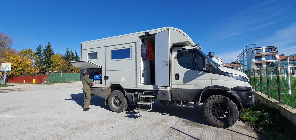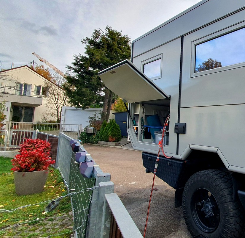 Jetzt noch schnell Wasser tanken, Lebensmittelvorräte auffüllen, vor allem die Ritter Sport. Noch ein letzter Blick in all unsere Checklisten und dann könnte es auch schon los gehen, wäre mir nicht in letzter Sekunde aufgefallen, dass die PV-Anlage nicht die volle Leistung bringt. Bestimmt nur stark verschmutzt. Also noch kurz das Dach abspritzen, bevor es auf die Autobahn geht.