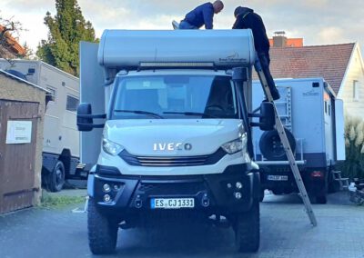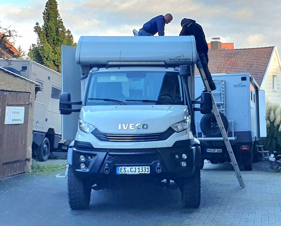 Wir beschließen, nicht nach Saudi Arabien, sondern lediglich nach Reutlingen zu fahren. Ist nicht ganz so weit wie geplant. Dort werden die PV-Module hergestellt. Feuchtigkeit hat den Anschlussblock zum Kochen gebracht und ein Modul hat sich verabschiedet. Nach mehreren Diskussionen und Abwägungen wollen wir die Reise schnellstens beginnen, auch ohne Modul. Wird schon gut gehen. Der Weg von Reutlingen nach Asien führt uns an unserem Flugplätzle in Münsingen vorbei. Es folgen noch ein Stopp in Ulm und ein weiterer Stopp bei Harry Batari, unserem Fahrzeugbauer. Er überbrückt das stillgelegte Modul, damit nichts passieren kann und am nächsten Tag soll es weiter gehen. Eigentlich wollten wir schon weiter sein aber: