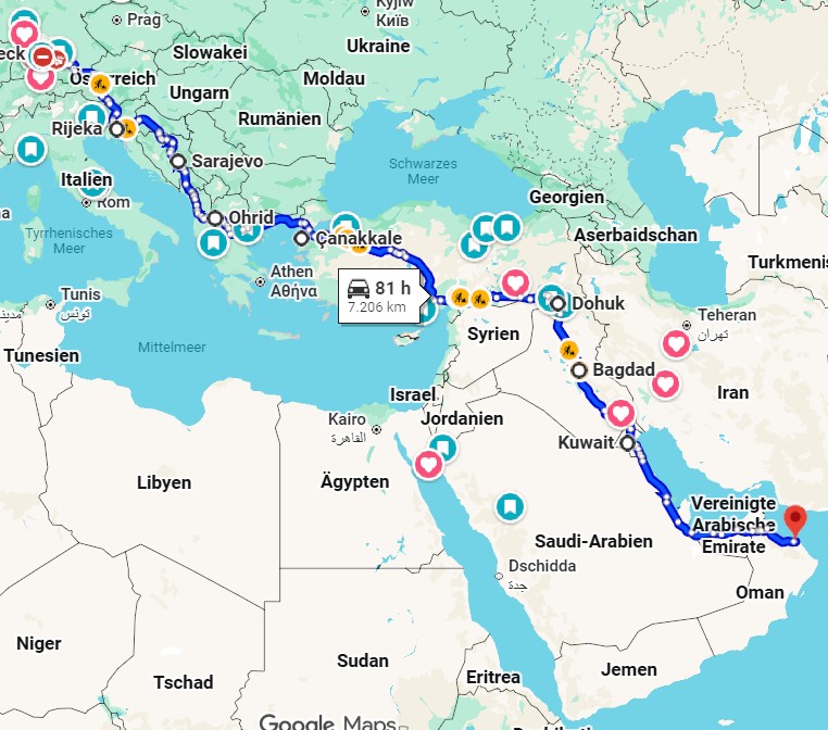 Nun ist es soweit: Unser Ziel – arabische Halbinsel, Saudi Arabien, VAE, Katar, Oman, Jordanien. Wochenlange Vorbereitungen liegen hinter uns. Die e-Visas beantragt. Vor uns liegen ca. 7.000 km.