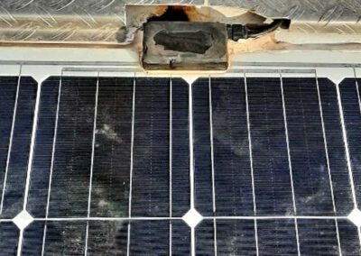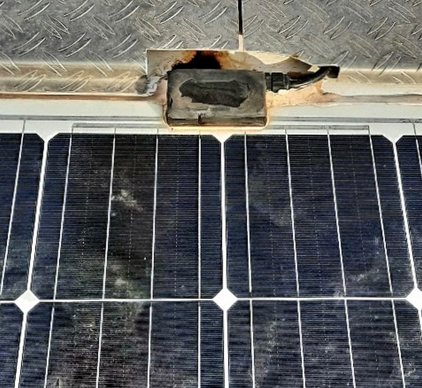 Und als ich mit dem Dampfstrahler auf dem Dach stehe, sehe ich an einem Diodenblock eines PV-Moduls eine rostfarbige Masse austreten. Schau mir das etwas genauer an und bemerke, daß es um diese Stelle herum kochend heiß ist. Na das fängt ja gut an.